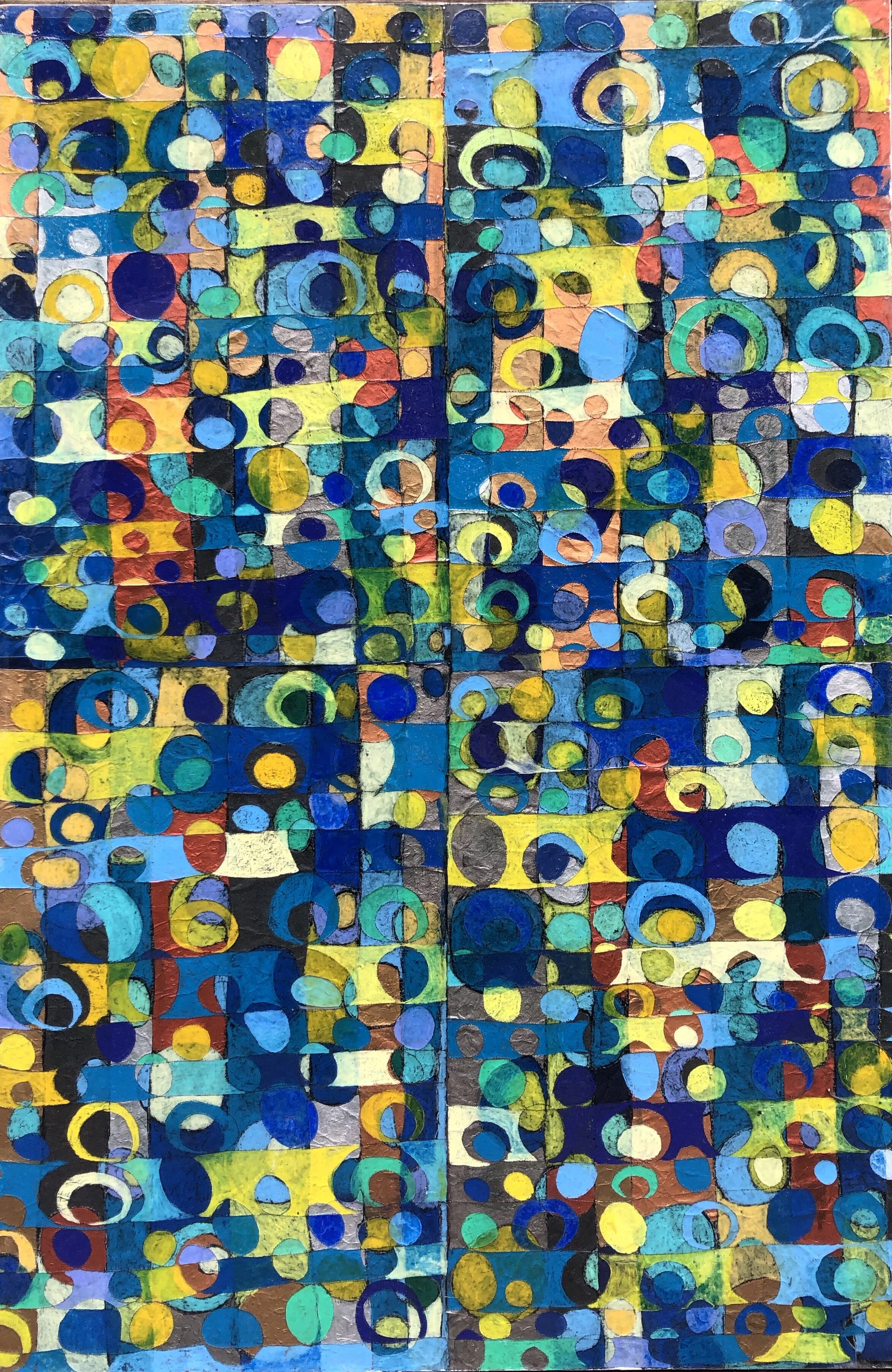 Acrylic paint, neocolor watersoluble II crayon, stitch and resin on Khadi paper mounted on board